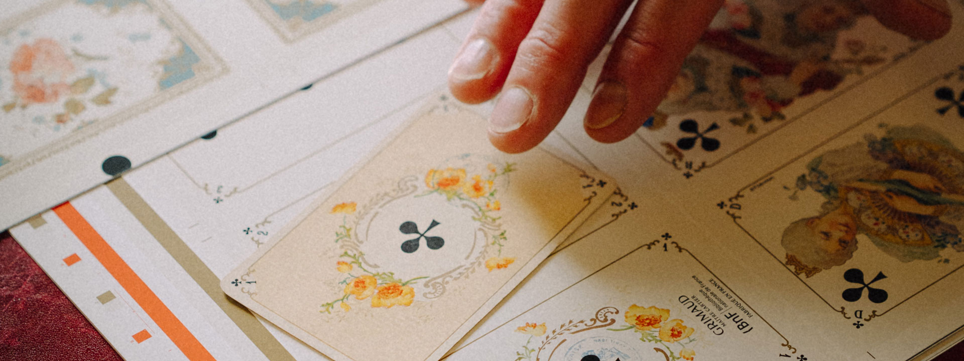 Aux commandes de Grimaud à l’époque de la création de ce jeu se trouve l’un des neveux du fondateur, Georges Marteau, collectionneur, amateur d’art japonais et de miniatures persanes. Celui-ci s’attache les services de l’artiste Jules Habert-Dys, peintre, graveur et illustrateur, tenant d’un mouvement en plein essor : l’Art Nouveau, dont l’influence se remarque dans les courbes des visages féminins et les motifs floraux et végétaux. La chromolithographie rend justice à la finesse du dessin, et les premières touches de bleu dauphin et de rouge corail apparaissent au dos des cartes et sur les étuis – couleurs phares des jeux de cartes Grimaud tels qu’on les connaît aujourd’hui.